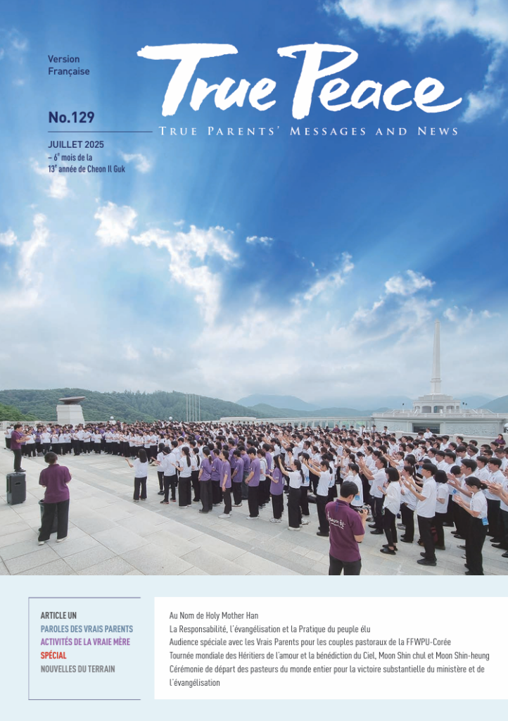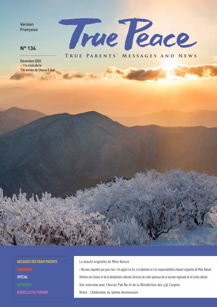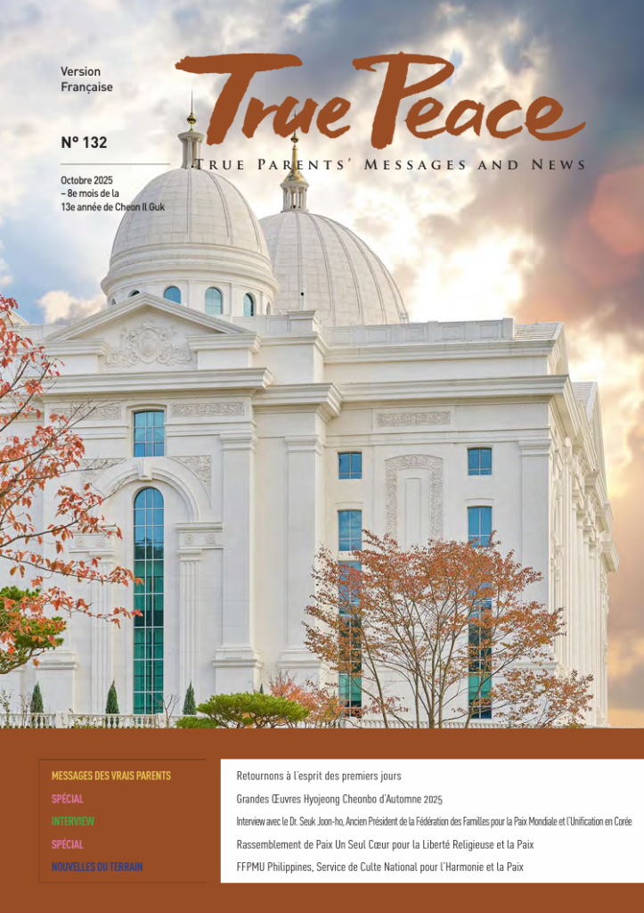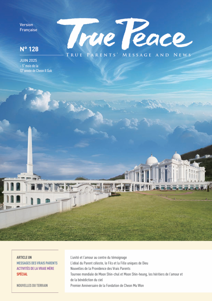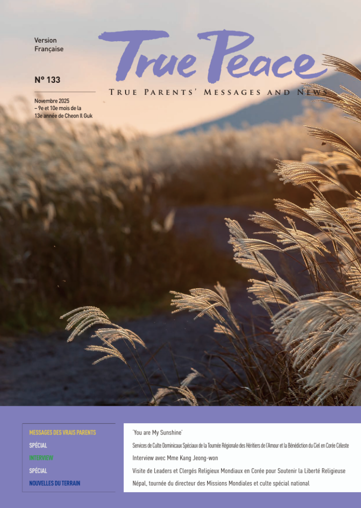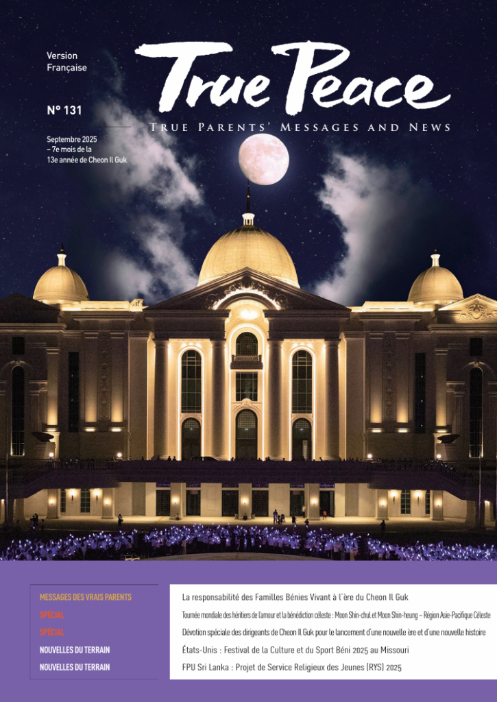 True Peace est un mensuel d’information traduit en français et consultable en ligne. Les nombreux articles de ce journal retracent l’actualité internationale liée à l’avancement de la mission mondiale pour la paix. Ils reprennent aussi les discours des fondateurs donnés tout au long de leur ministère, ainsi que des conseils et éclairages concernant la vie de foi.